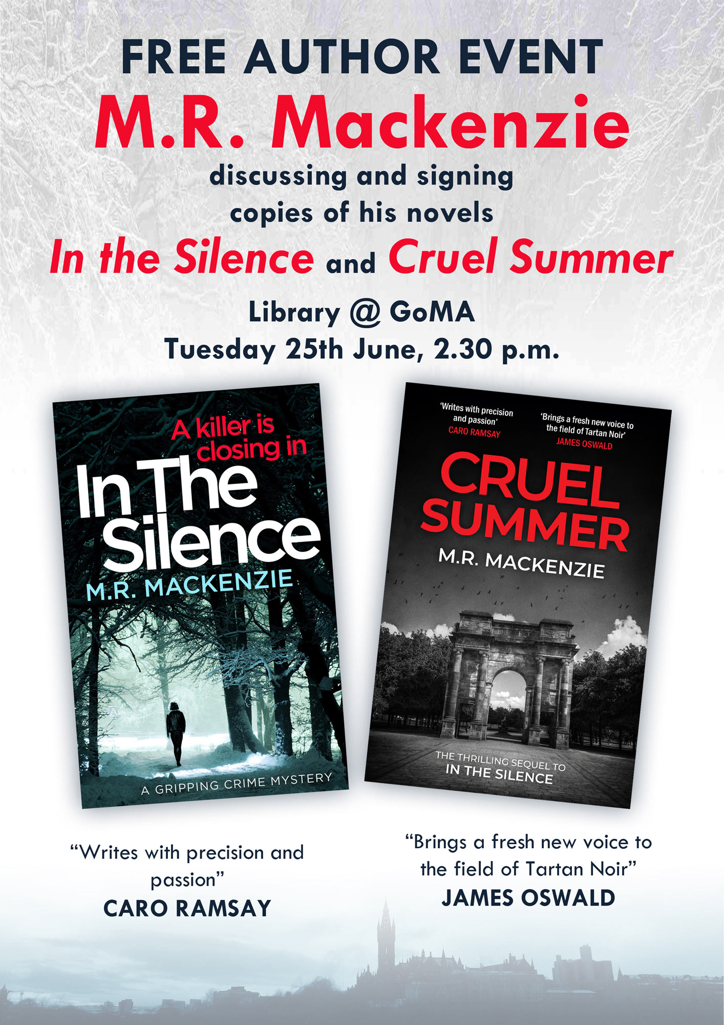 Just a heads-up to let you know that I’ll be doing a free author event in the Library @ GoMA in Royal Exchange Square, Glasgow on Tuesday 22nd of June at 2.30 p.m. I’ll be reading extracts from and discussing both In the Silence and Cruel Summer, and selling and signing copies as well. Hope to see some of you there!